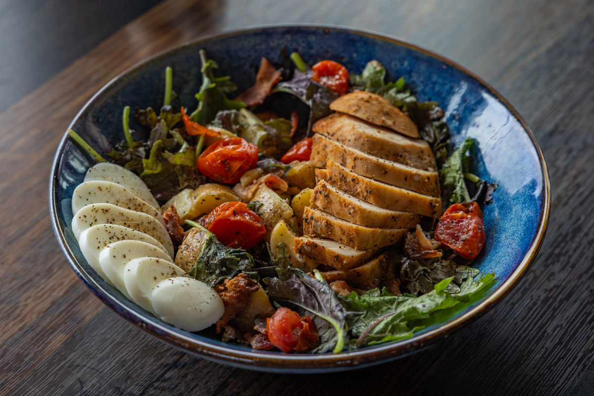 | Sunrise Cobb VP, GF, DFP Grilled Chicken Breast, Baby Potatoes, Greens, Smoked Bacon, Chopped Egg, Charred Tomatoes, Blue Cheese Dressing Substitute Grilled Chicken with Spiced Tofu |
