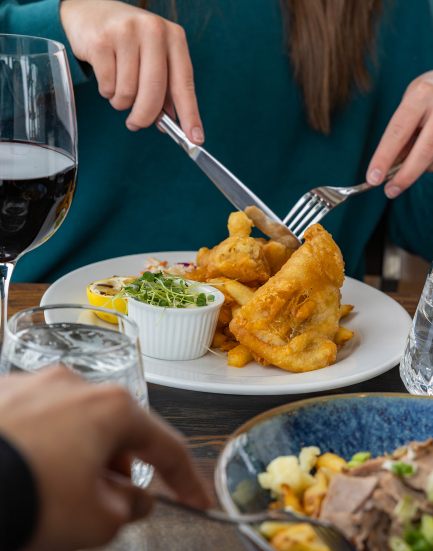 | Fish And Chips Beer Battered Cod Fillets, Fries, Charred Lemon, House Tartar Sauce |